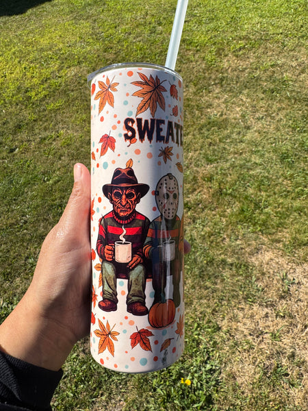 Cozy meets creepy 👻🍂 with this Sweater Weather 20oz stainless steel tumbler! Featuring your favorite horror icons in their fall sweaters, this tumbler is perfect for spooky season vibes.