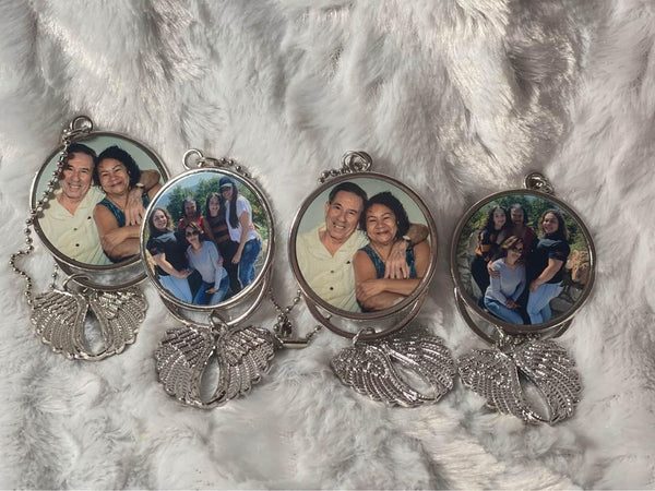 .Beautiful angel wing car hanger. Approx total 3.5" long, comes with a approx 9.5" ball chain that you can cut to size you want it. You can get either a single sided image or double sided image ( Just the picture area is double sided if you choose double sided)
