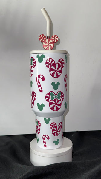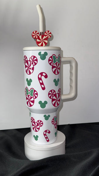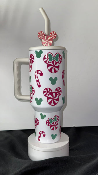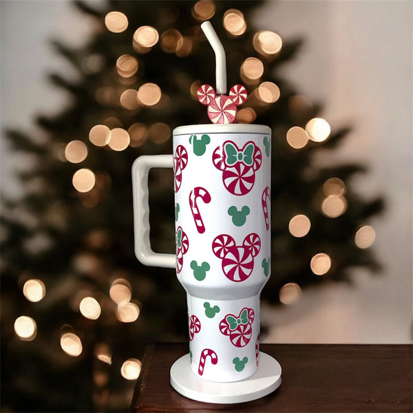 This festive tumbler features candy canes, peppermint swirls, and mouse ear patterns in classic red and green — perfect for sipping your favorite holiday drinks all season long.